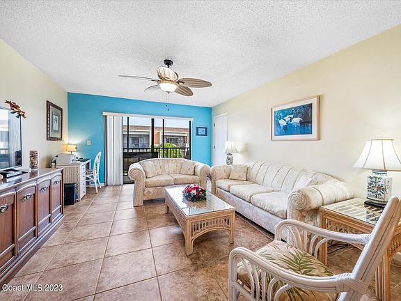 You might not see the ocean from this unit but with the windows open you definitely can hear the sound of waves lashing in. Quite often you can see the launches from Cape Canaveral rushing past the sky from your balcony. This unit has had many upgrades including newer air/heating system, impact windows, upgraded bathrooms all in 17 & 18, hurricane shutters on the balcony and many, many more. The unit is fully furnished with almost everything one would need. This unit is strategically located on the east side and in the center of bldg. 10 and protected by several buildings east of it, making it as safe location as possible from the weather. Dues include but not limited to: water/sewage, roof, internet/cable, pest control & trash.