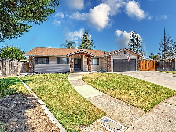 Seller offering concessions. The Single Story STUNNER you have been waiting for! Modern Immaculate turnkey home! Located in a quiet cul-de-sac. Discover a bright & open layout featuring a spacious living room w/ modern electric fireplace, dedicated dining area & functional kitchen. Home was beautifully remodeled with waterproof Luxury Vinyl Plank flooring, Updated kitchen with appliances, elegant cabinetry, quartz counters, pristine island with bar seating, farm style sink, fresh paint, New modern light fixtures. New whole house Water filter system. 4 bedrooms, 2 bathrooms with a spacious extended family room making it a total of 2075 sq ft. Primary suite with outside access. The living room flows seamlessly into a huge backyard. Seller will complete the exterior stucco on the extended family room. Roof was replaced approximately 5 years ago. Large 10K sq ft lot, with room to entertain, add a pool, and enjoy. Close to schools, shopping, This home will not last long, on the well-known famous Christmas Tree lane in Turlock for the Christmas train track that travels the court during the Christmas season.