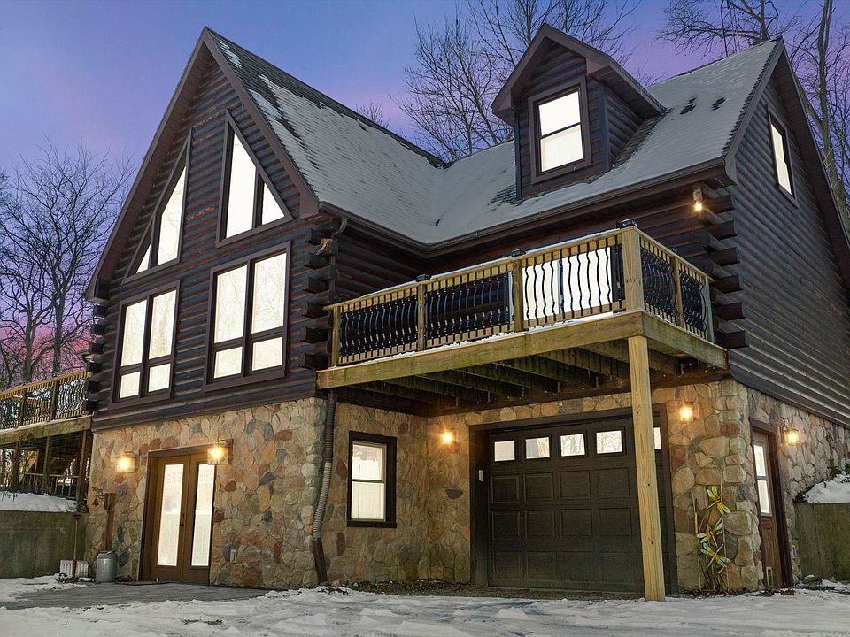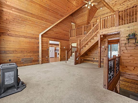 Tucked away in a densely wooded 5 acre paradise, sits this beautiful log home. Built in 2003 with three living levels and a heated 30x60 outbuilding. A long driveway leads you back to the front entrance. Where you'll immediately fall in love with the setting. Here you can enjoy nature first hand. Multiple open decks and fire pit area allow you fully submerge into the country lifestyle. The main level showcases soaring ceilings with an abundance of windows. Allowing natural light in and giving you a serene view of the woods. Just off the great room, the dining area and spacious kitchen share an open concept and ample cabinet space plus nearby half bath, laundry room with service door. Newer laminate flooring compliments the style of the home. A private sitting room can also be used as an office space. Main level primary bedroom has private en-suite and large walk in closet. At the second level, you'll find additional bedrooms and full bath. The finished basement hosts a large family room with finished concrete floors, adjacent kitchenette, half bath, unfinished storage space and attached garage. The outbuilding features a heated, insulated shop and is ready for you. Seller has made numerous improvements over the past few years including the roof, decks, laminate floors and more!