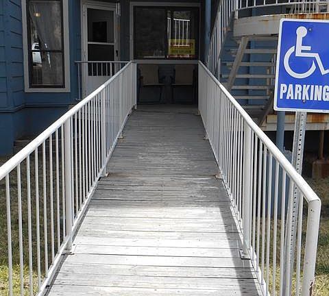 A 2bedroom - 2 bath unit -ground level with a handicap ramp-the master bath is handicap ready-the shower has hand bars/grab bars-seat in shower-open cut under the sink/vanity-raised toilet w/garb bar-wider door entry-lower switch and plug in. The living room has a wood burning fireplace. 2ond bedroom is large enough for computer desk area. Guest bath has a walk in shower unit. Split floor plan. Dinning area and a nice sized snack bar. Newer items include-Carpet and pad-freshly painted kitchen cabinets- counter tops-disposal-hot water tank. Also a combo, all in one washer/dryer unit. Take a look its clean and fresh, most furniture items will transfer. HOA includes garbage, water, and sewer.