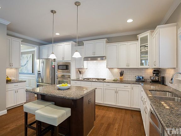 PRICE DROP! Stone accents & wrap around front porch accentuate curb appeal of beautiful Bella Casa home in award winning Apex. Hardwood floor thru main level, gourmet kitchen overlooks family room w/ custom built ins. 1st floor guest suite w/ full bath. Master suite w/ fab bath, tray ceiling, large WIC. 3rd floor features 5th bedroom & "man cave" w/ wet bar rough-in. Decadent screen porch overlooks fenced/flat yard! UNREAL VALUE AT $485K-CHECK THE COMPS: PRICED AT $132/SF this home presents a TRUE VALUE.