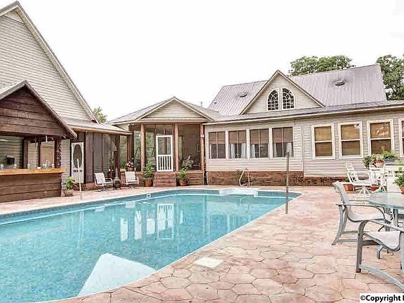 Great home on 1.6 acre lot with an additional 2.2 acres available for purchase. Nice hardwoods and fireplace in living room. Has an additional den open to the living room making a large space for entertaining. Master is a good size and had a glamour bath with a garden tub and separate shower. Screened back porch with a built in hot tub that over looks the in ground pool. 42x36 detached garage that can hold 6 cars and also has an apartment above. Conveniently located between Huntsville and Lake Guntersville.