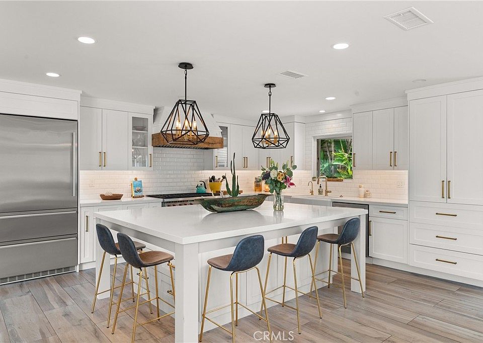 Absolutely stunning single level home on a private corner lot in a cul de sac in the highly sought after iconic Shorecliffs community, just steps away from the ocean! Open concept floorplan with over 1600 square feet of gorgeously upgraded living space and large great room with built-ins and la cantina doors leading out to private yard. Entire home has been recently upgraded including the entertainer’s kitchen with oversized center island with seating, upgraded appliances, beautiful quartz counters, white shaker cabinets, all high end stainless steel appliances and much more! Master bedroom has walk-in closet and master bath with vaulted ceiling and skylight. Other upgrades/updates include recessed lighting, ceiling fans, new windows, tankless water heater, AC, fabulous wide plank wood style tile flooring throughout, custom window coverings, custom paint and so much more. Wonderful outdoor living with large private front courtyard with peek a boo ocean view and easy maintenance rear yard with a “She Shed”, all new exterior concrete throughout. The Shorecliffs community offers a private beach club located on the sand with a clubhouse, tennis courts/pickle ball courts and more. Additionally, this community is surrounded by the challenging 18 hole Shorecliffs Golf Course which has a newly renovated clubhouse. Short bike ride to downtown San Clemente with awesome dining, shopping and entertainment!