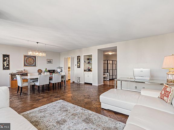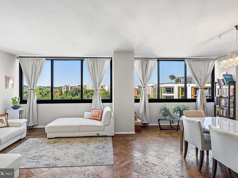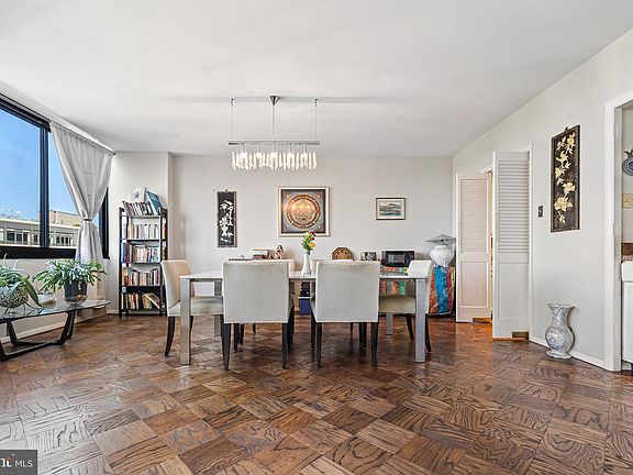 Spacious 1275 sq ft residence with open cityscape vista! Oversized one bedroom, one full bath plus powder room. Picture windows span across interior. offering abundant natural light. Open floorplan with large living room. Separate dining area with wet bar. Iconic oak tiger parquet floors. Bright bedroom, primary bath with separate tub and shower. Powder room and inviting entry with Italian original marble. Ample closet space, plus large additional storage room. All inclusive fee includes property taxes, utilities, maintenance of HVAC and basic cable. Watergate West amenities include 24-hour front desk & doorman service, heated outdoor pool, roof terrace with spectacular river views, fitness center, beautifully landscaped gardens, plus on-site shops & restaurants. Walking distance to the Kennedy Center, Georgetown Waterfront, Foggy Bottom Metro, Watergate Hotel & Spa, and restaurants.