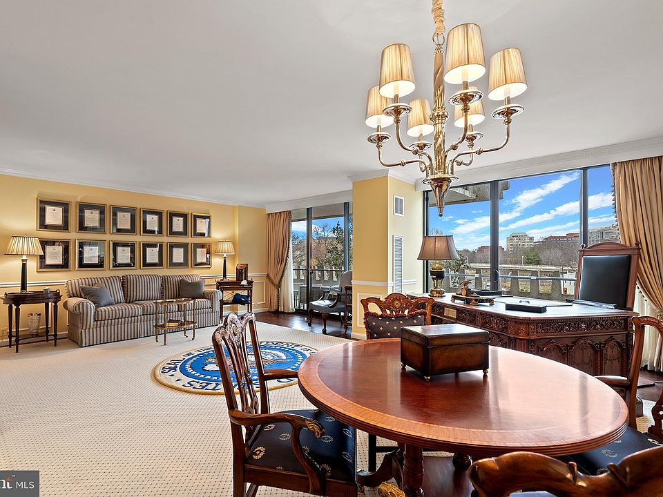 Sophisticated renovation - 1290 sq ft interior in meticulous condition. Long , wide balcony and floor to ceiling windows span the length. Ready to move-in! Just bring your suitcase! For a "turnkey" pied-à-terre style home or a full-time Washington residence, most of the furniture, art, and accessories are available for purchase! Hardwood flooring. Elegant wallcoverings, moulding and wainscotting. Excellent lighting. Most furniture included in sale, including the same desk that is in the Oval Office! Stunning entry foyer with granite floors and fine wallcovering. Spacious living and dining area. Custom built-ins. Wet bar with glass shelves . Powder room with exquisite wallpaper, striking vanity and sconces, gold Ribbon and Reed satin nickel hardware with satin gold accents. Gourmet kitchen features: KitchenAid appliances , Aristokraft Durham cabinetry in Glacier Gray, Caesarstone counters, glass tile backsplash with Orbit Meteor accent tile, 12 x 24 Silver Marlin floor tile, Custom drapery and rugs. Spacious primary suite with custom designed closet. Spectacular primary bath with expansive double vanity with 2 sinks and custom storage. Luxurious walk in shower with tile surround. Beautiful flooring and counters. Primary bath fixtures have satin and brushed nickel hardware. Ample closet space throughout, plus additional storage room. $44,000 underlying mortgage is deducted from cash due at settlement, and corresponds to the $301 fee noted in this listing. All inclusive fee includes property taxes, utilities, maintenance of HVAC and basic cable. Watergate West amenities include 24-hour front desk & doorman service, heated outdoor pool, roof terrace with spectacular river views, fitness center, beautifully landscaped gardens, plus on-site shops & restaurants. Walking distance to the Kennedy Center, Georgetown Waterfront, Foggy Bottom Metro, Watergate Hotel & Spa, and restaurants.