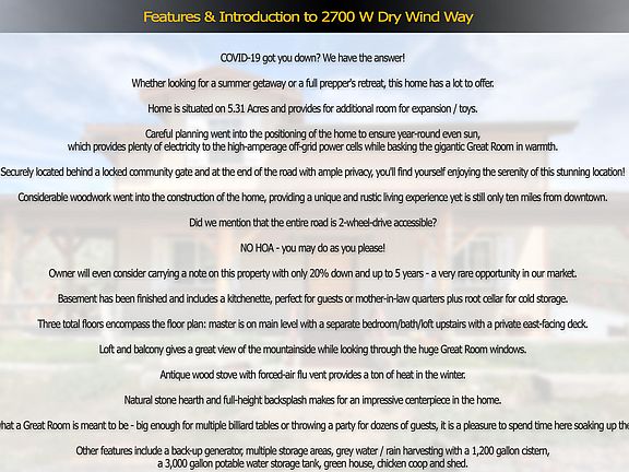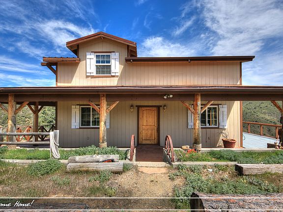 Seller says Bring All offers!! Home is situated on 5.31 Acres, is only a 25 min drive from downtown Prescott and provides for additional room for expansion / toys. Careful planning went into the positioning of the home to ensure year-round even sun, which provides plenty of electricity to the high-amperage off-grid power cells while basking the gigantic Great Room in warmth. Securely located behind a locked community gate and at the end of the road with ample privacy, you'll find yourself enjoying the serenity of this stunning location! Considerable woodwork went into the construction of the home, providing a unique and rustic living experience yet is still only ten miles from downtown. Did we mention that the entire road is