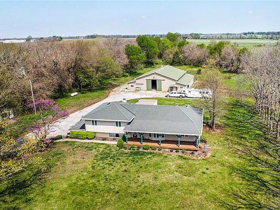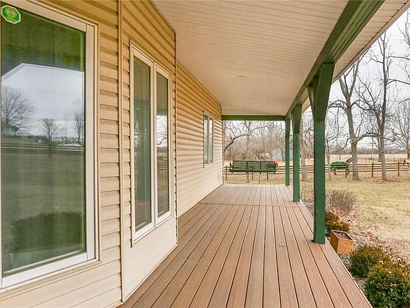 Hard to find lovely 10+/- acre Equine Facility! Bring the kids, horses and your pets to their new move-in ready home. Updated kitchen with granite countertops, 2021. New non-maintenance decks and railings, 2023. New Septic, 2024. New loafing shed in pasture. Master ensuite with huge walk-in closet, double sink, separate shower and jetted tub. Wood flooring throughout home. 4-stall 60x80 barn including wash area, tack room office and shop area. Paved road with easy access to both I-35 and 169 highways. 45 minutes to KCI airport.