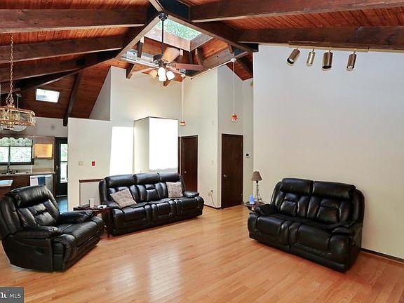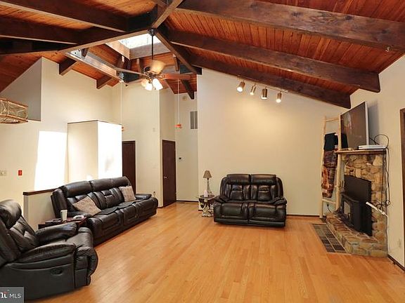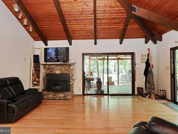 Mother Nature here we come! This one of a kind home is nestled amongst the trees and beautiful 5.07 acre lot. Vaulted wood beamed ceilings with a skylight at it's peak. Wood floors with stone fire place on main level. Wet bar and wood stove & full bath on lower level. Brand new paved driveway Detached 1,000 sq ft garage with electric, heat, AC unit. 10,000 lb auto lift 200 amp and 230 power.