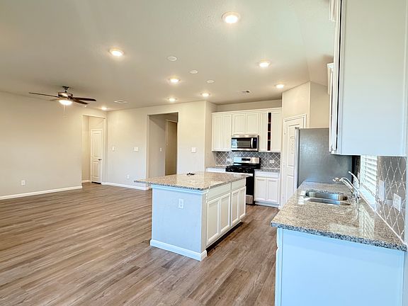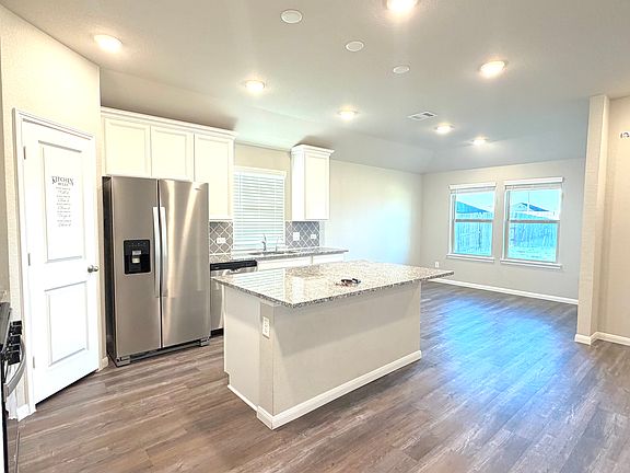 -Kitchen with refrigerator included, granite counters, and large island