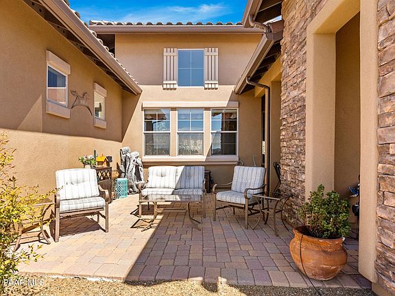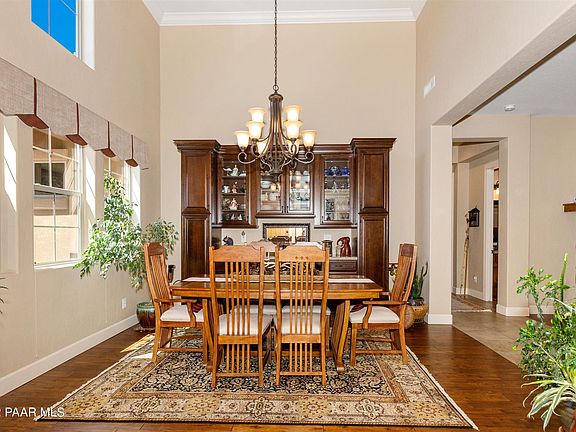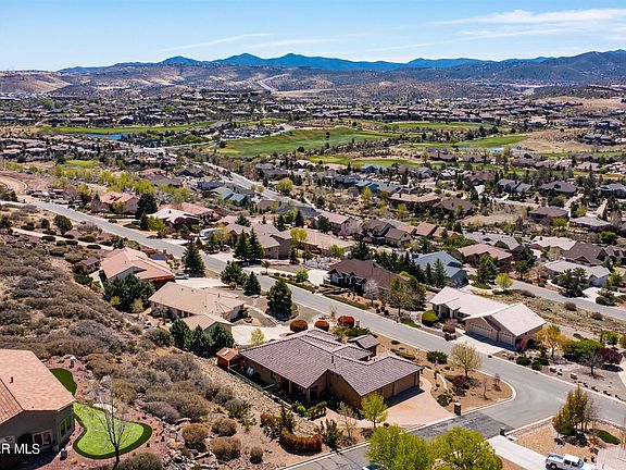 RARE 2015 finished, orig owner, single level-no steps home on elevated corner lot w/ HUGE Views south of Pres Lakes Golf Crs, Mtns & Thumb Butte. 3 bedrm + luxury Office, 3.5 baths, Grand foyer with formal dining rm, 15' ceiling & rich built in buffet, hardwood floors. Great room w/gas-stone surround fireplc, breakfast area w/quartz top cabs, kit island w/barstool counter & drop lamps. Gourmet kitchen, granite slab, with KitchenAid SS appliances, gas cook-top, soft close cabs & w/in pantry. Dual glass french doors to bk garden covered patio. An over sized Master suite, his & her walk in closets w/direct access to util rm, dual sink-granite vanity, separate w/in shower, tub & water closet. Huge frt yard, 3 car ext garage, level paver driveway with 50 AMP RV servc and a Tuff Shed! ++++