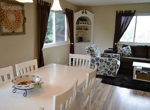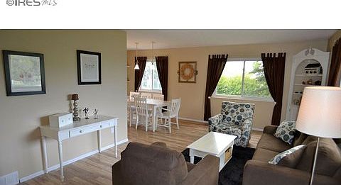 Remodeled to please with mountain views. Nestled on 1.2 acres. Open and bright. Pottery Barn-style finishes. Big master bedroom with private luxury bath. Living room plus recreation room with brick fireplace and energy-saving stove. Finished basement with built-in sink and cabinets. Abundant, mature landscape. Even a playhouse! Additional outbuildings for hobbies and storage. Zoned for horses and chickens. Affordably located just north of Boulder County with top-rated Berthoud schools!