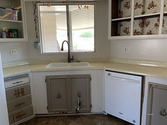1978 manufactured home that sits on a good sized fenced-in lot. 1,344 square feet of living space. Two bedrooms, two bathrooms. The second bathroom needs a commode and sink installed. The main bathroom has a garden tub, shower and dual sinks. Good size laundry room. Lots of cabinet space in the kitchen. Nice little dining area off the kitchen with a pellet stove and a sliding glass door leading to the covered porch. Two car detached garage with unfinished workshop area. Carport for possibly a boat or recreational vehicle parking. Also, a shed and several covered storage areas behind the garage. Close to schools and shopping. Needs tlc. Property is being sold as is.