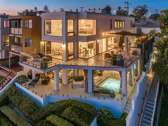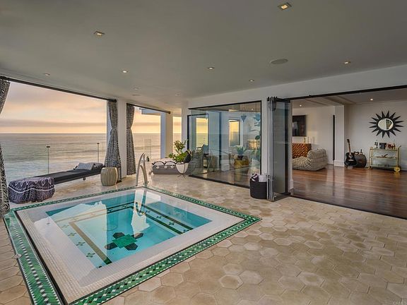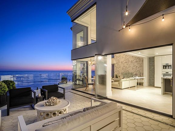 Stunning ocean-front three-story contemporary home features a unique collaboration between architectural and interior design by Tiffani Baumgart, a local San Diego designer, who created an experience like no other. It’s all in the details: this bespoke home was carefully thought out with custom high-quality elements that took years to gather from around the globe. Both the home and designer have been featured in: WSJ, Architectural Digest, Better Homes & Gardens, MyDomaine, Mansion Global and Modern Luxury. The achromatic color scheme offers tranquility with striking patterns and textures that uniquely adorn each room. The color scheme allows the dramatic focal points of the ocean and sunsets to be accentuated through every room of the house. The element of light is carefully layered into the design, from the movement of the sun, to the soothing glow from the dimmable lights that are controlled with a Lutron system. This smart home is easily controlled from anywhere in the world with your smart phone to construct any desired mood, where you can situate the lights, blinds, heat and jacuzzi. The SieMatic kitchen cabinets have an innovative use of space with a timeless style, which were custom designed by Baumgart. The Calcutta marble waterfall island has an inset Spekva brand wood slab detail at the four-person breakfast bar that is complimented by the Lindsey Adelman light fixture, Miele and La Cornue appliances and imported Swedish tile backsplash. The jewel of the dining nook is a pendant by Lindsey Adelman, and the star burst Hanley chandeliers in the two-story ceiling of the living room by Arteriors, which is also a focal point from the primary bedroom. The primary suite is designed to capture direct ocean views from the private second story loft-style room with a large bathroom with steam shower, vessel tub, private water closet with bidet, dual sinks, a large custom walk-in closet with custom built-in cabinets and shelving. The lower level features the a large private jacuzzi with an imported tile surround, a lounge area with an imported French hammered tin ceiling and French antique door wainscoting. This double lot has a vast outdoor living space with the expansive multi-level decks and courtyard, which allow a true indoor-outdoor experience from each living area, especially when the frameless folding Cover Glass doors slide open. The courtyard by the front of the home is a welcoming entry home with a custom crystal water feature, custom horizontal light wall and landscaping. The energy efficient home has 33 owned solar panels, tankless hot water heater, whole home radiant heat and in-floor radiant in each bathroom. Three blocks to iconic Carlsbad Village, which is the downtown commercial area of Carlsbad and is a center for arts, culture, shopping and dining.