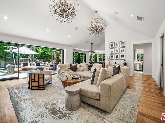 Sun-drenched elegance meets modern luxury in this impeccably renovated single-story retreat. The expansive open floor plan boasts soaring ceilings and walls of glass, seamlessly connecting formal living and dining areas to a resort-style backyard oasis complete with a lush lawn, sparkling pool, and a built-in BBQ ideal for entertaining. The oversized chef's kitchen is outfitted with premium appliances and abundant counter space, making it both functional and impressive. The primary suite is a serene haven with pitched ceilings, dual custom closets, and a spa-like bath featuring upscale finishes, separate shower and soaking tub, dual vanities, and two water closets. Three additional spacious bedrooms offer flexibility for family or guests. The finished garage is climate-controlled and perfect as a gym, playroom, or creative studio, with generous built-in storage. Recent upgrades include a 120 sq ft laundry room with sink and cabinetry, Tesla charger, rich hardwood floors, designer lighting, bespoke tilework, and charming crystal hardware throughout. Fully walled and hedged for ultimate privacy, this turnkey property is a true sanctuary located near the prestigious Roscomare Road Elementary School. Available now-