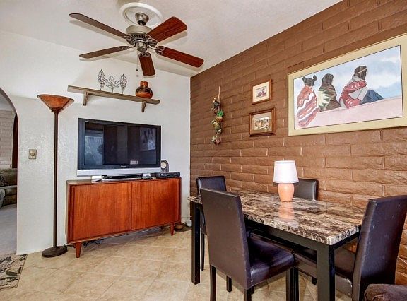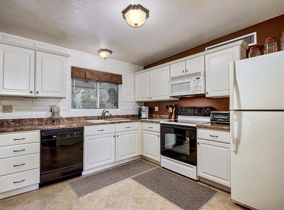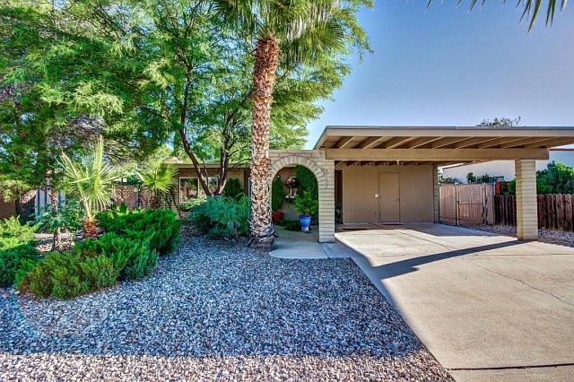 Absolutely Charming Vintage Home with meticulous desert landscape and move-in ready! Cozy fireplace, warm interior palette, ceiling fans, plush neutral carpet, and upgraded lighting. Fantastic eat-in kitchen features beautiful tile floor, patio access, stylish laminate counters, black/white appliances, and white wood cabinetry with hardware. Great gathering place for family and friends. Generous size bedrooms with plenty of closets. Updated bathrooms! Peaceful & serene backyard boasts extended covered patio, lush green landscape & foliage, paver patio for dining, and lots of shade trees.