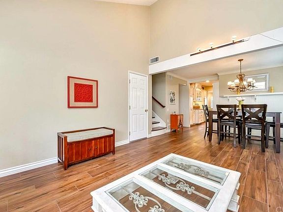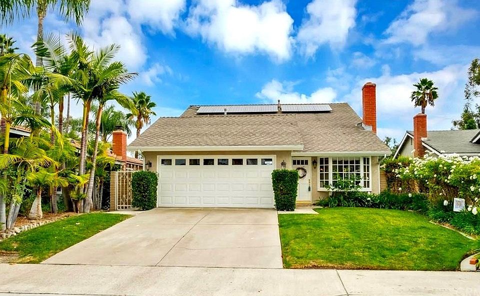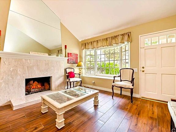 Views for miles! This beautifully remodeled Barcelona home is located on a quiet cul-du-sac street in a low property tax base area. Located just a couple houses down from a lovely community park and within walking distance to Oxford Elementary Charter school. The spacious front Living-room has a romantic fireplace and a large bay window overlooking the white rose garden. There is a separate formal dining area. The gourmet kitchen features granite counters, a breakfast bar, custom cabinets and lighting with newer appliances. The large Great-room addition has a fireplace, built-in cabinets and french doors leading to the massive entertainers backyard. Bathrooms have been remodeled with custom tile work, new vanities, new shower enclosure and the upstairs bathroom has a jetted tub. There is a nice sized bedroom on the main level located next to a bathroom with a large walking shower. All upstairs bedrooms have valley and city light views. Additional upgrades include a security system, house attic fan, solar system (paid off), recent exterior paint, designer interior paint and much more! Home ownership includes access to private Lake Mission Viejo.