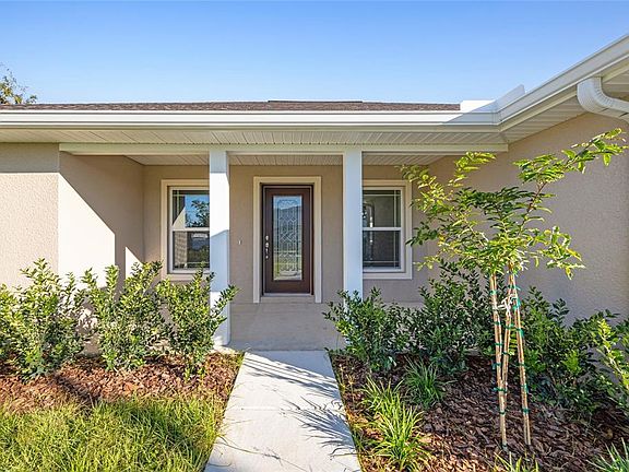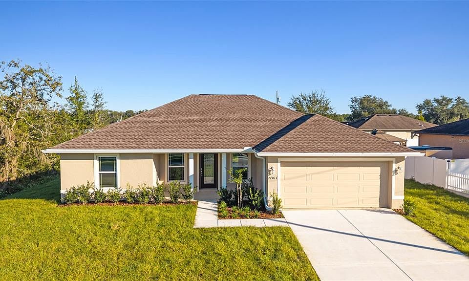 One or more photo(s) has been virtually staged. Welcome to 27017 Mott Avenue in Brooksville, a move-in-ready, brand-new construction home completed in October 2025. This beautifully designed 3-bedroom, 2-bathroom residence offers the perfect blend of comfort, functionality, and contemporary style. Nestled on a generously sized lot, the home features a spacious open-concept layout with soaring vaulted ceilings, a modern kitchen with granite countertops, soft-close cabinetry, stainless steel appliances, a walk-in pantry, and a large center island that seamlessly connects to the dining and living areas. The primary suite is thoughtfully positioned for privacy and includes a walk-in closet and en-suite bathroom with dual sinks and a tiled shower. Durable tile flooring flows throughout the main living spaces, while plush carpet creates a cozy feel in the bedrooms. Outside, enjoy peaceful backyard views, mature trees, and room to add a future patio, garden, or fence. With a two-car garage, an indoor laundry room, energy-efficient windows, and neutral finishes throughout, this home is the perfect canvas for your personal touch. Conveniently located with easy access to I-75, local shops, restaurants, and schools, this is a fantastic opportunity to own a brand-new home in a quiet Brooksville neighborhood. Full upgrade list available in MLS attachments—schedule your private showing today!