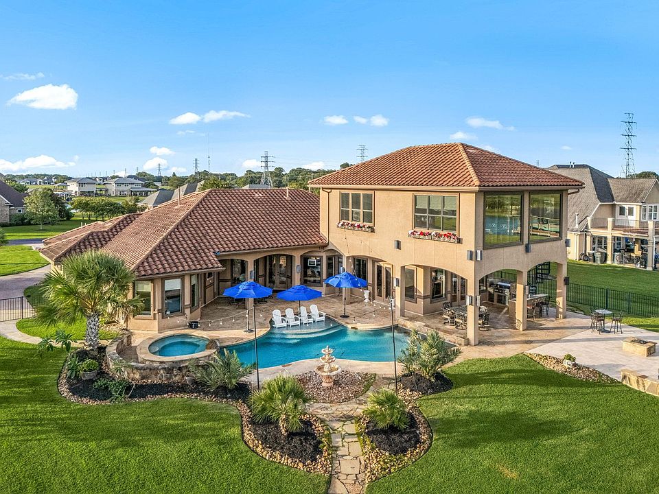 Stunning waterfront estate with elegant architecture, lush landscaping, and a private dock with boat slips and sandy beach. Inside, enjoy open-concept living with a chef’s kitchen, beamed-ceiling family room, and rich wood library. The luxurious primary suite features lake views, spa-like bath, and bay window sitting area. Upstairs offers a game room, guest suite, and covered balcony with sweeping views. The backyard is an entertainer’s dream with resort-style pool, spa, outdoor kitchen, fire pit, and expansive patio with new decking (July 2025). Side-entry garage, motor court, and separate oversized garage provide ample parking. Thoughtfully designed for comfort, luxury, and year-round enjoyment. Property features a whole house generator.