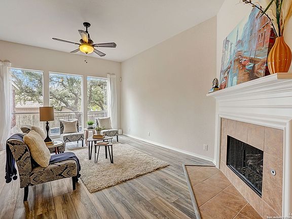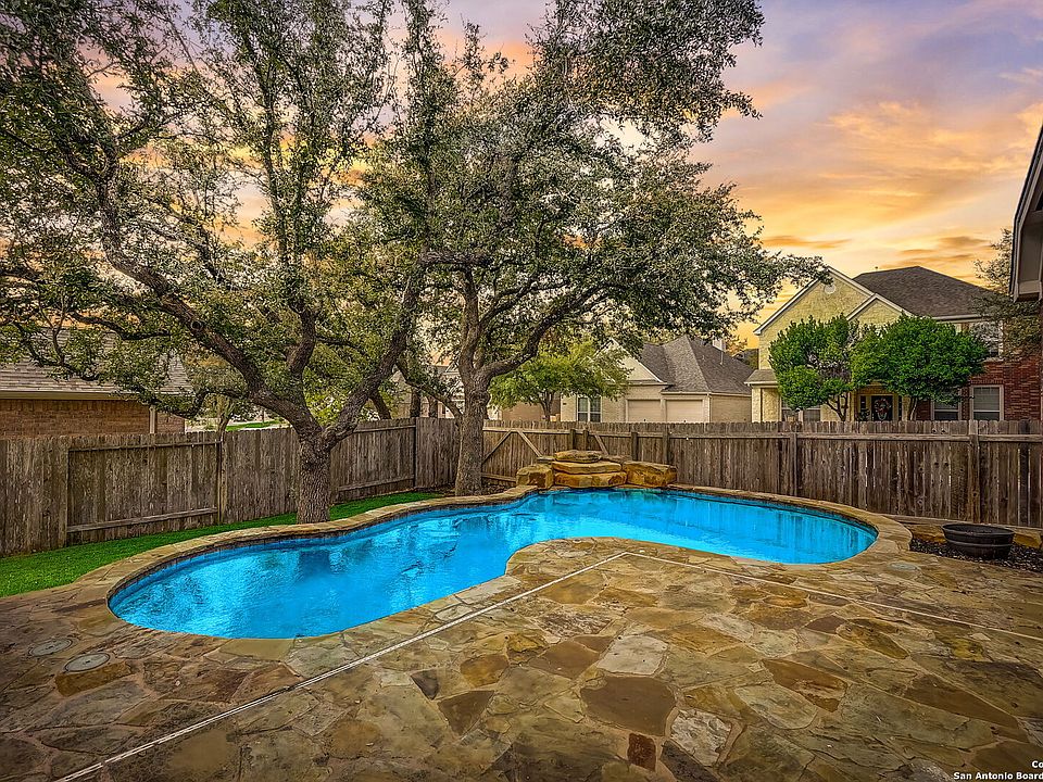 Gorgeous, Move-In Ready Single Story Home with 3 Car Tandem Garage, a Sparkling Keith Zars Pool, 4 Bedrooms, 3 Full Baths, and an Office in Gated Trinity Oaks! From the Fresh Paint Throughout to the Just Installed Granite Counters in the Kitchen to the New Carpet in the Secondary Bedrooms to the Elegant Plantation Shutters to the Upgraded Stainless Steel Appliances, this Home is Truly Turnkey! You will love cooking and baking in your Expansive Kitchen Featuring 42" Cabinets, your Walk-In Pantry, that Opens to the Spacious Family Room complete with Fireplace, Beautiful Flooring Overlooking your Private Pool. Oversized Laundry Room boasts shelving and cabinets, HUGE Garage offers Utility Sink and Water Softener! Retreat to your Primary Suite Offering a Spa-Like Master Bath with Walk-In Shower and a HUGE Walk-In Closet with freshly installed warm floors. Relax in your peaceful backyard complete with a spacious flagstone patio, an inviting pool, mature trees, and a storage shed. Excellent Community Amenities including Pool, Park, Food Truck Thursdays, and Gated Access. Outstanding Comal ISD and Zoned to New Pieper High School! No City Taxes!