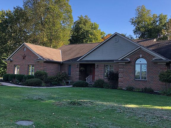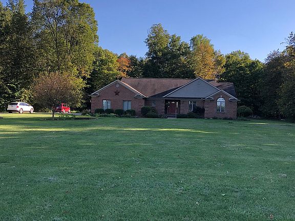 This 2212 sq’ custom-made home is beautifully nestled in a wooded area on 7.365 acres. Home has open floor concept with 2 bedrooms, an office and 2.5 baths. Office can be converted into 3rd bedroom. Interior of home boasts high vaulted ceilings in living areas and 2nd bedroom. The custom kitchen cabinets have pull-out shelves, island and solid surface countertops. There is a fireplace with gas insert to provide warmth and ambience. The master bedroom has a tray ceiling and the master suite includes a shower, garden tub and nice walk-in closet. Entire home has custom made blinds and window coverings. Home has low maintenance brick exterior with screen guards over gutter. Large 16’x20’ deck is worry-free made of composite decking material and a 3-car garage provides plenty of room. Home has city water and electric. A buried propane tank is owned by homeowner and allows you to choose your propane supplier. A large unfinished basement has endless possibilities with 10’ ceilings. Extra protection from water is provided as sump pump has cemented confinement area. Must see to appreciate quality construction and features.