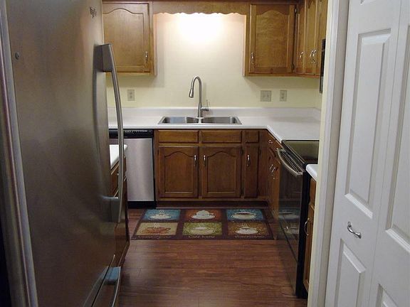 Low Maintenance! 3 bedroom, 2 full baths, woodburning fireplace. Master on 1st level. Newer SS appliances, refrigerator remains. Laminate floors throughout first level. Vaulted ceilings in living room. Covered back porch with pergola and privacy fenced yard. Parking in front or rear of the building.