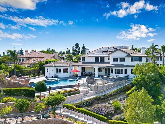 Discover unparalleled luxury in this breathtaking canyon view home located in the charming city of Yorba Linda. This exquisite Vista Bel Aire estate features five spacious bedrooms and five elegantly designed bathrooms, all complemented by soaring two-story ceilings and vast open spaces that invite natural light to dance across the interiors. As you step through the grand double doors, you are greeted by a sophisticated ambiance that radiates elegance at every turn. The living and dining areas, adorned with towering ceilings and walls of windows, create a bright and airy atmosphere, while a cozy fireplace adds a touch of warmth and character. The expansive kitchen is a chef's dream with three dishwashers ideal for large party or daily family use, showcasing custom cabinetry, built-in appliances, and ample bar seating, seamlessly connecting to an oversized family room for the ultimate entertaining experience. Sliding doors lead out to a private outdoor oasis, complete with stunning mountain views, an infinity resort-style pool with 4 colored LED lighting, Rock Grotto, waterfalls and oversized slide. On the main level, you’ll find a well-appointed bedroom, a full bath, and a half bath, providing convenience for guests. Ascend one of the two elegant staircases to discover the oversized primary suite, featuring a fireplace, a cozy sitting area, vaulted ceilings, dual vanities, and a luxurious soaking tub. The second floor also offers three generous bedrooms, two bath, and a spacious loft with captivating views. Additionally, this property includes a fully equipped separate ADU featuring 1 bedroom and 1 bath, perfect for rental opportunities or extended family, complete with its own furnace, water heater, air conditioning and laundry room. Notable features of this remarkable estate include electric blinds, a 4-car garage with hooks for electric vehicles, RV parking port with power supply and cleaning drain, a robust 400 amp electrical panel, an automatic gas shut valve, and a leak detection system for peace of mind. Enjoy the advantage of a spacious close to 2/3 acre lot fully fenced, professionally landscape irrigated by a 16 station sprinkler system, which is fairly rare in the area. Additionally, a new 5-hole putting green recently added for entertainment. With the added benefit of paid oversized solar, this extraordinary home fulfills every desire you could imagine. Don’t miss your chance to experience this stunning estate—come see it for yourself!