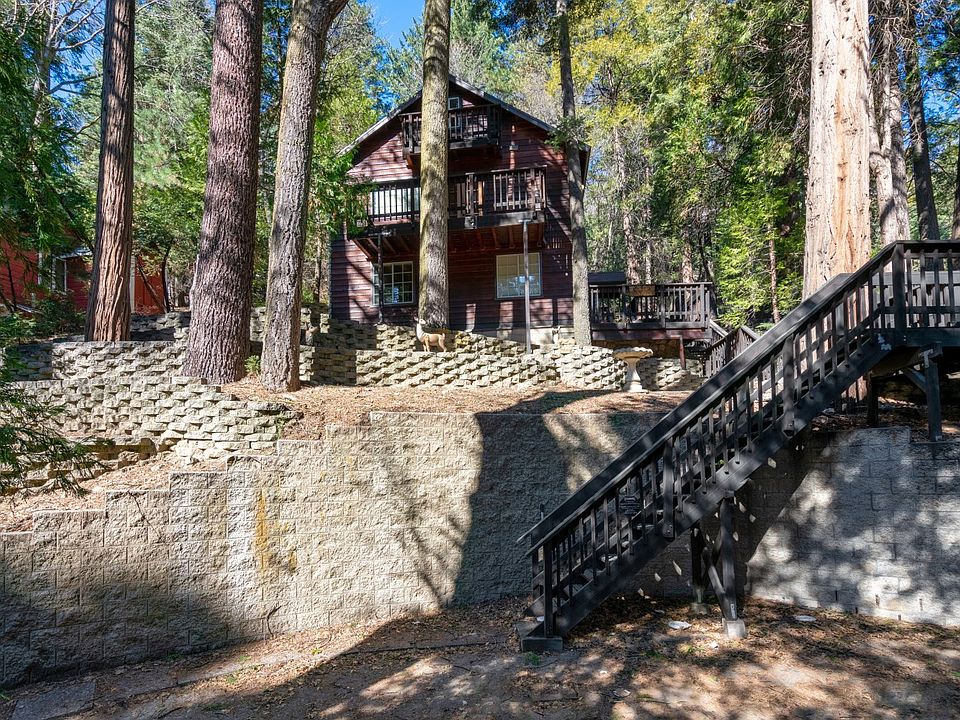 A picturesque cabin sequestered away in scenic Blue Jay! Surrounded by enormous tress, this two-story stunner is a classic woodland masterpiece with rustic wood siding, fabulous wood decks, and private balconies with amazing nature views. Vintage style wood paneled ceilings throughout are complimented by wood panel wainscoting, a combination of recessed lights and ceiling light fixtures, plus plush carpet and laminate flooring. Entertain with ease in this spacious living room with formal dining area where a red-brick fireplace creates a cozy ambiance for every season. A center skylight further illuminates a vibrant kitchen offering neat white tile countertops, wood cabinets, built-in appliances, and a cute casual dining area. The two secondary bedrooms are detailed with plush carpeting, wood beamed ceilings, and forest views from the large French windows. The largest bedroom is a soothing retreat complete with a private balcony. As a great plus, this home includes all furniture and has a fantastic bonus room up in the attic. Residing only minutes away from nearby markets, shops, Lake Arrowhead Village, and the glittering Blue Jay Bay! Enjoy sweet serenity today!
