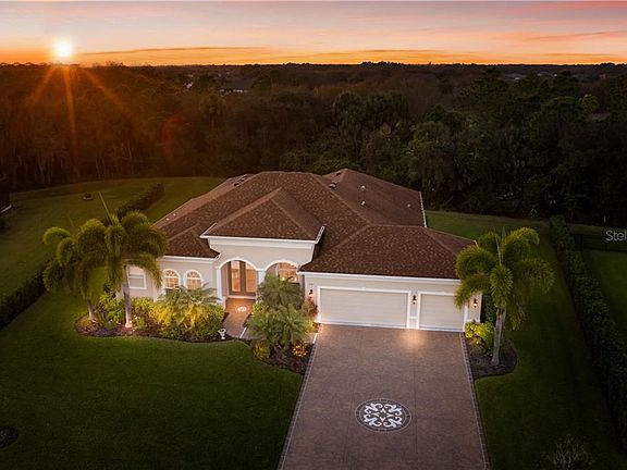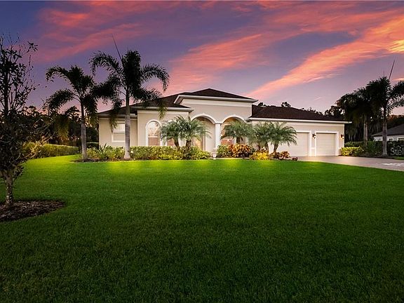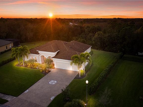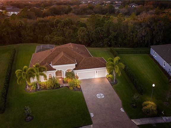 Constructed in 2016, this magnificent home sits on a beautiful half acre+ plot in the desirable community of Twin Rivers. The front of the home looks out across the beautiful yard to a pond just across the quite road and to the back, your tranquil nature views are protected as the yard abuts a conservation area. This Medallion home features the Barbados VIII floorplan with four bedrooms and three baths plus a den, offering the pinnacle in style, functionality and comfort. Approach via the custom driveway and enter into the elegant foyer where a generational, hand-blown glass light adds a touch of grandeur. So many exquisite details, such as oversized 24" tile, lofty tray ceilings, oversized doors, rounded corners, and high-end fixtures and finishes make this home feel luxuriously welcoming. Prepare the perfect meal in the stunning gourmet kitchen--fully equipped with stainless steel appliances, oversized hardwood cabinets, granite countertops, a convenient butler's pantry and breakfast bar. Join for a casual meal in the delightful breakfast nook and take in scenic pool views through the oversized aquarium style window. Equally as lovely, the formal dining room is perfect for a large party or more intimate gathering. The family room and living room are on opposite sides of the kitchen and both offer access out to the expansive lanai for wonderful ease of indoor/outdoor living. Private and serene, the screened in lanai surrounds the sparkling salt water pool and can easily accommodate a fabulous summer kitchen. Host a cookout while surrounded by lovely mature landscaping and tranquil nature views beyond. All of the bedrooms are spacious and comfortable including the huge master suite which enjoys its privacy apart from the secondary bedroom with it's split floor plan. Dual walk-in closets, a spa style bath with dual sinks, soaking tub and walk-in shower, plus access out to the pool and also to the den make this an idyllic retreat. Also enjoy a utility room with washer and dryer, and a three-car garage with built-in shelving. An enviable lifestyle awaits you! Schedule your showing today. Located within the pet-friendly Twin Rivers community you have easy access to amenities like a playgrounds, basketball court, soccer field, a beach volleyball court, nature trails, and a boardwalk. This community offers the perfect chance to take your family and friends kayaking or fishing and it was laid out to be visually appealing and provide spacious and private backyards for your enjoyment.