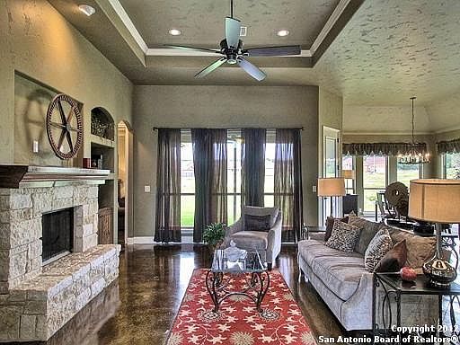 Lantara Builders model home in Champions Village. This beauty features stained concrete, carpet, and wood floors, open floor plan, rock fireplace, corner lot, epoxy garage floor, radiant barrier roof, stamped and stained patio, granite counters, stainless appliances, huge walk in closet and shower in master. Located in the gated Champions Village subdivision on a corner lot with a sprinkler system.
