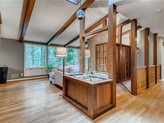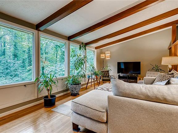 This is a wonderful mid-century modern ranch home nestled on a 3-acre large private lot in a quiet, well-established neighborhood. Features include original vaulted ceilings, wood beams, exposed brick walls, and separate dining and living rooms with picture windows of the private green space. Enter from the side into an open airy eat-in kitchen with a large peninsula. The home boasts original lighting fixtures, original hardwood floors, floor-to-ceiling windows, and views of the lush landscape. It also offers a new roof and skylight, and a separate large wood storage building. The home sits on a street featured in the Netflix hit show "Stranger Things." This home has a bonus multimedia room downstairs with space to be creative. The Ring doorbell system and security cameras are included as well! The washer and dryer are included.