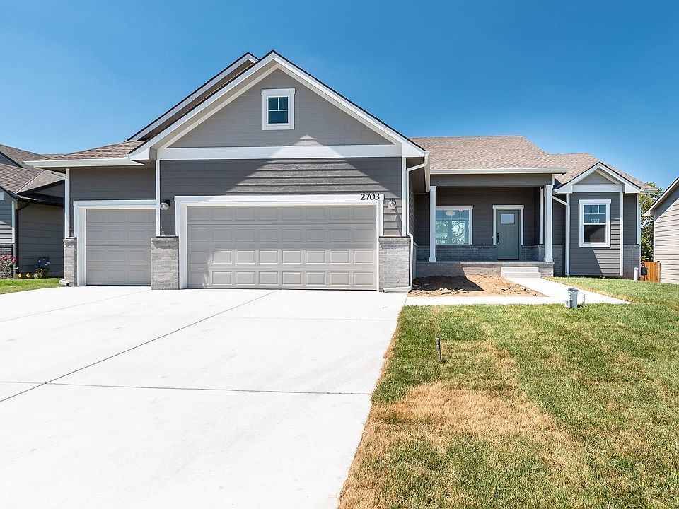 Another beautiful home featuring the ever-popular spacious Stockton floor plan will have you saying when can I move in? This open split 3-bedroom floor plan with three car garage and recessed garage stairs leading into the home with a tree lined backyard will not disappoint! Upon entry, you are greeted to an open floor plan with lots of natural sunlight, 10’ ceilings, a custom designed fireplace with mantel and shelves, and a tray ceiling. The designer kitchen is equipped with a decorative backsplash tile, stainless appliances, quartz countertops, large island perfect for entertaining and a walk-in pantry. The dining area has a door leading to a covered deck overlooking a large backyard. The spacious master bedroom anon -suite has double sinks, walk-in shower, and walk-in master closet. The laundry room is conveniently located off the hallway next to the back door and drop zone. The unfinished basement has the potential of 2 bedrooms, full bathroom, wet bar, and a large family/rec room. Miller Family Homes include a dual zone HVAC system, a passive radon system, energy efficient Pella windows, Wi-Fi Thermostat and garage door opener, and cooktop vented to the outside. This home also includes a finished yard with sod, sprinkler system, and an irrigation well. Southern Ridge offers a saltwater pool, playground featuring a sport court with tennis and basketball, lots of walking paths, and stocked community ponds. Located off West Pawnee and South Maize Road, Southern Ridge is a short drive away from all the west side attractions like Pawnee Prairie Park, multiple golf courses, groceries stores and New Market Square. Homes in Southern Ridge offer quiet seclusion from the city with plenty of space. Come see why Southern Ridge is a great location for your new home!