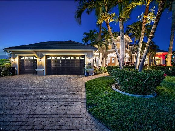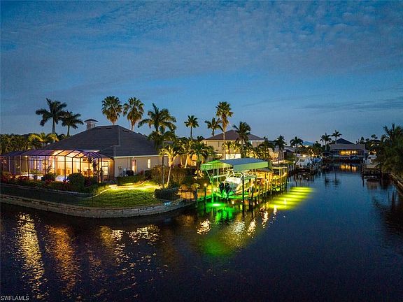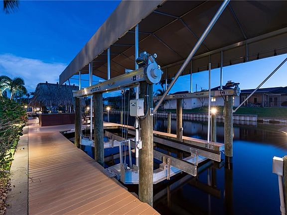 Discover the epitome of waterfront living in this exquisite Cape Coral gem! With an unbeatable location boasting 235 feet of water frontage on intersecting canals just a few hundred feet from the river, this direct-access estate home offers a luxurious lifestyle. The remarkable residence features 5 bedrooms, 4 bathrooms, and an oversized 3-car garage. Inside, you'll find open living spaces with soaring ceiling heights, elegant finishes, and a well-equipped kitchen. Step outside to your private paradise with resort-style amenities, including a Tiki bar, a huge dock with a covered 20,000lb boat lift and 10,000lb double jet ski lift (2023 Boston Whaler & Jet Skis available), a beautiful heated and automated pool, and a dramatic state-of-the-art outdoor lighting and security system. The panoramic views of the water add to the allure of this waterfront haven. Built for comfort and peace of mind, the home boasts a new tile roof installed in 2021 and two newer HVAC systems for year-round comfort. Whether you're seeking luxury, security, or relaxation, this home seamlessly combines all three. Immerse yourself in the ultimate waterfront experience with this captivating Cape Coral residence.