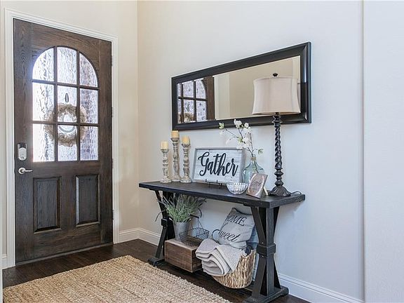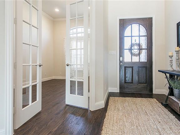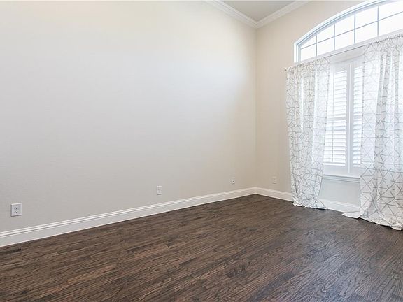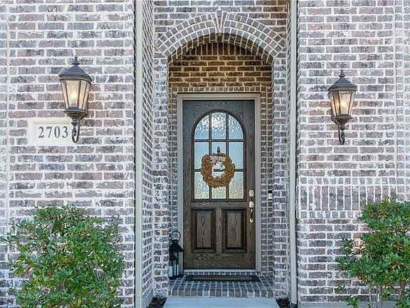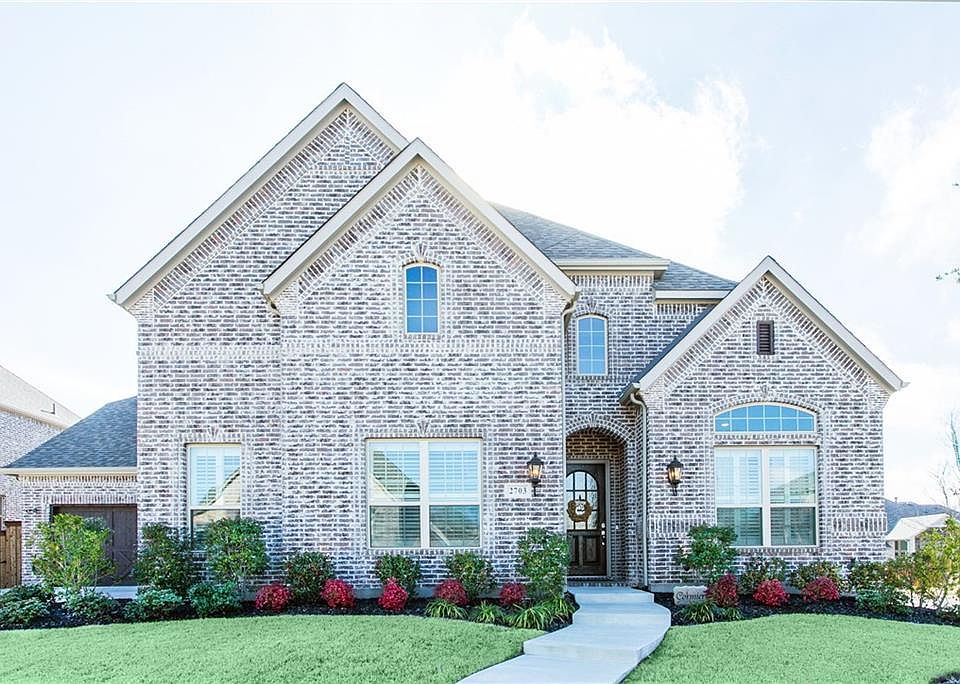 Gorgeous open floor plan on corner lot in Mustang Lakes. 5 Bedrooms and 5 full baths with 2 half baths. Master bedroom and mother in law suite downstairs with 3 bedrooms upstairs each with own private bath. Downstairs 2 story living room featuring decorative tile fireplace and 3 picture windows open to kitchen and breakfast area. Kitchen features upgraded GE monogram stainless appliances and a 10 x 5 granite island with farm sink. Office is also downstairs with French doors. Upstairs family room and media room. Home features wood floors in downstairs living areas along with plantation shutters.