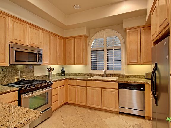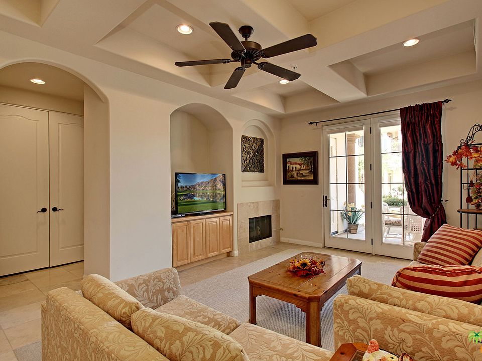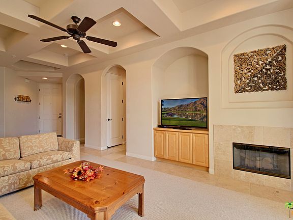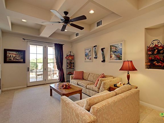 Welcome home to the highly sought after 55 or better community of Villa Portofino. This lowest priced two bedroom, two bathroom, plus den unit features a gas fireplace, high coffered ceilings, travertine floors, granite counters, private secluded patio, wet bar in the den, separate tub and shower in master bathroom with dual vanities, large walk in closets and more. Your HOA dues include water, cable with expanded movie channels, high speed internet, gas, trash, sewer, building insurance, quarterly exterior window washing, pest control, clubhouse, complimentary exercise and yoga classes, free movies and more. Take a dip in the junior olympic size swimming pool or just relax and enjoy some of the best views Palm Desert has to offer.