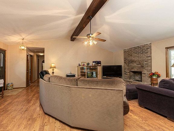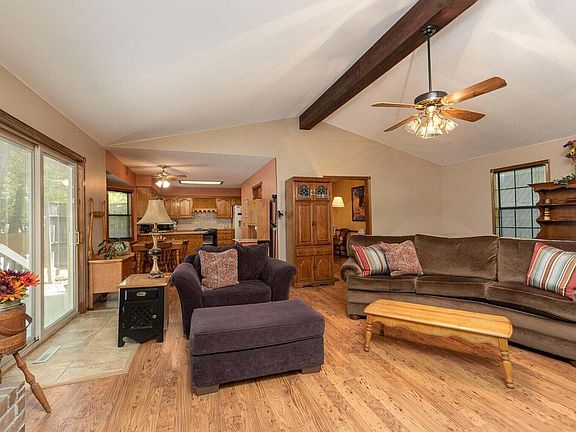 Tucked away in the trees on 3/4 AC and boasting large spaces throughout. An absolutely Huge living room with brick wood burning fireplace and vaulted ceilings welcomes you. The Large dining room is separated from the kitchen by a breakfast bar. Lots of cabinets and counter space plus pantry and walk-through laundry. Large master suite with private rear deck access, big closet, double sinks and walk-in shower. 2 more bedrooms with another full bathroom + a bonus room that would make for great home office, play room or library. You will fall in Love with this .74 AC yard; Dotted with mature trees, it's level and inviting while giving that extra room to stretch and do hobbies. Quality construction with wood cabinets and trim, solid core hardwood doors. Brand new roof in 2022?