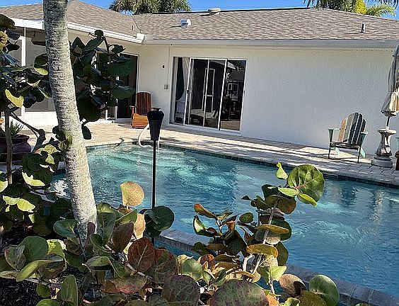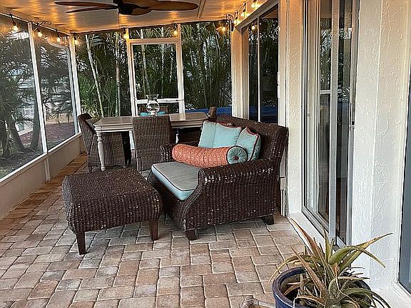 This canal home feels larger than it is with tons of light and several living spaces situated around the open kitchen. Lots of character with artistic details in this home. Screened porch with market lights and ceiling fans offers even more living space to enjoy and entertain. Pool is surrounded with mature landscaping and has a nice deck area plus there is a step down patio with firepit area before stepping onto custom deck with sitting area and covered boat lift (being remodelled 2021).