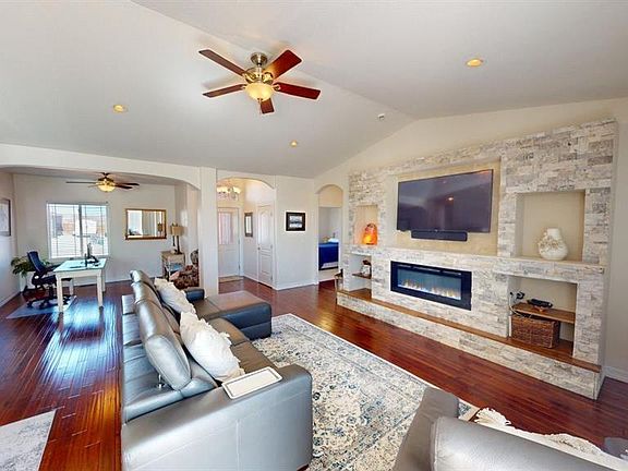 Welcome to this beautifully maintained and upgraded home on the north side of Alamosa. Nestled on a spacious, landscaped lot, this home is ready for you to move in and enjoy. Inside, you'll find stunning updates throughout, including rich hardwood floors, a striking rock wall with built-in fireplace, TV area, shelves, and wood accents that add a touch of elegance. The kitchen, laundry room, and dining areas feature fresh tile flooring, while the updated kitchen boasts new quartz countertops and a stylish tile backsplash. All bedrooms are fitted with high-quality carpeting for added comfort. The spacious primary suite offers a peaceful retreat with a large bedroom, walk-in closet, double sinks, a tiled shower and a jetted tub. The kitchen boasts plenty of cabinet and counter space, along with a cozy breakfast nook and bar seating for casual dining. A versatile bonus room off the living area can be used as a formal dining room, office, den, or additional living area to suit your needs. Step outside to the beautifully landscaped yard, complete with an irrigation system, a back patio perfect for entertaining, RV parking and numerous trees. This home has so much to offer—schedule your showing today and experience it all for yourself!