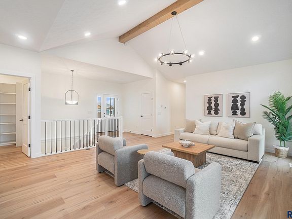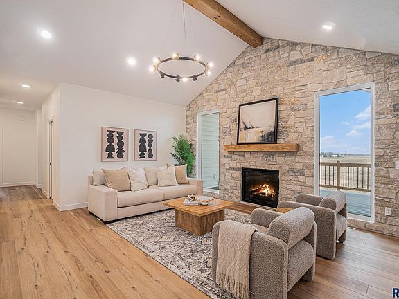 Welcome to this stunning new construction ranch walkout, where modern elegance meets timeless craftsmanship. This beautifully designed home features 3 spacious bedrooms, 2 bathrooms, and a generous 3-stall garage, offering plenty of space for storage and convenience. The heart of the home is the exquisite kitchen, showcasing custom cabinetry, sleek quartz countertops, and high-end stainless steel appliances. The open-concept living room boasts a striking stone-encased fireplace, soaring vaulted ceilings with rich wood beams, and a stunning chandelier that adds warmth and sophistication. Retreat to the primary suite, where vaulted ceilings and wood beam accents create a serene and inviting atmosphere. The luxurious en-suite bathroom is designed for relaxation, featuring a double vanity and large tile shower. This beautiful new construction is the perfect place to call home!