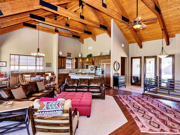 Escape to the perfect golf retreat, being sold ''Turn-Key'' Furnished (furniture/decorations available by separate agreement) set in the cool pines of The Rim Golf Club with panoramic golf and mountain views! This mountain home features open, main-level living floor with three Master Suites. A spacious Great Room showcases a stone fireplace, wood floors, beamed and vaulted ceilings. The main-level master retreat opens to the large balcony so you can enjoy the tranquil views to the golf course, water ponds and expansive mountain views. Downstairs a spacious yet comfortable living area with a large patio and two Guest Suites await. This home is the perfect second home get-away or ideal for primary residence living. Come and enjoy the luxury this home offers with close proximity to club amenities - clubhouse, golf course, practice facilities and fitness center/spa. Choice of membership is available from the club. Come escape to this ideal home, just bring your toothbrush!