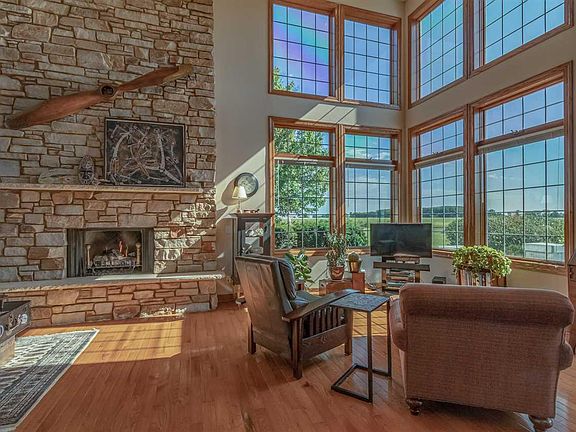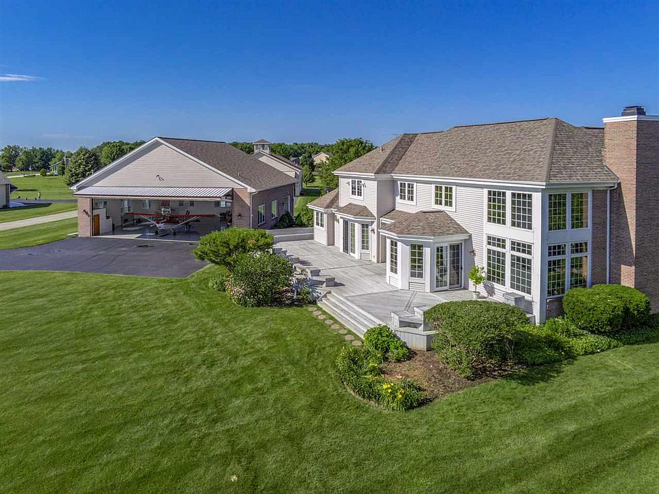Watch planes take off from almost every room of this custom built, two story, 2878 sq foot home. Located on the runway of the private public use Poplar Grove Airport, this open floor plan home on almost an acre of land is sure to please. Home features two story entry with tile flooring. Over size living room with 18 foot ceiling and floor to ceiling stone, gas fireplace. Island, eat in kitchen with cherry kitchen cabinets and Wilsonart counter tops. Oak hardwood flooring in living room, hall, and kitchen. Solid 6 panel doors and large profile oak woodwork thru out. First floor laundry with sink, and cabinets. Main floor master bedroom with outside access to deck. Master bath with Jacuzzi tub, walk in shower, and dual sinks. Upstairs loft area. Private BRICK 60x50 hangar with heated floor, hot water, half bath, 220 electric, and UV protection. Hangar door is 50 wide by 13 high. Perfect to store aircraft or hobby vehicles. Basement plumbed for bath.