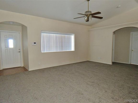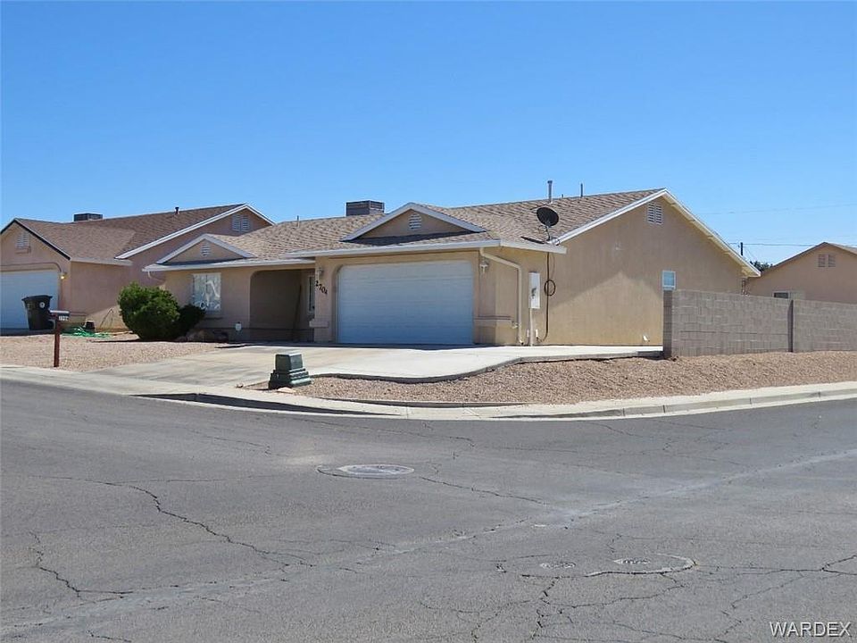 This Move In Ready, three bedroom, two bathroom home has 1,461 sf with a very comfortable split bedroom floor plan. The living room is good sized at 20.8 X 15.8 with vaulted ceilings, pot shelves and a big front window, plus there's ceilings fans and new carpet throughout. The kitchen has tons of counter space, breakfast bar, big corner pantry, electric range, microwave, dishwasher and side by side refrigerator. Large master is on the west side of the home with 3ft entry & bathroom doors and walk in shower. Attached two car garage with built in shelves, gas water heater and washer & dryer that stay. Rear covered patio, block wall and a creative RV space that's a 9.2 ft wide by 43 ft long concrete pad on the west side of the home. All of this sits on an oversized corner lot, Superba & Adams in Hualapai School District. 2704 Superba Ave. Kingman AZ