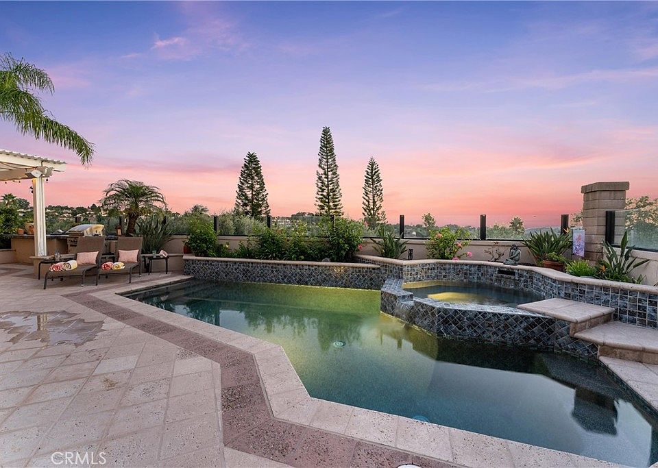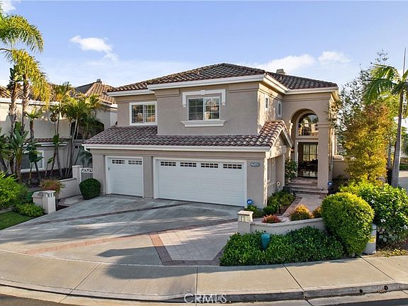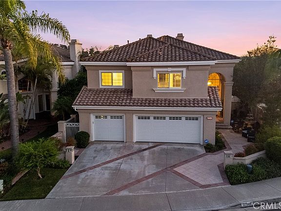 Welcome to your dream home with a panoramic view! Nestled at the end of a prime cul-de-sac in the prestigious Pacific Hills neighborhood, this home offers 4 bedrooms, 4 bathrooms, a loft, a primary retreat, a three car garage, pool and spa. Enjoy gorgeous travertine flooring downstairs and newer luxury plank vinyl & carpeting upstairs. A large entry hall with cathedral ceilings and abundant windows allows natural light to flood in, highlighting the striking staircase. The open floor plan offers spacious family & living rooms, a dining room, kitchen nook and bar top. The well-appointed kitchen features a six-burner Viking gas stovetop on the island, double GE ovens, newer microwave, rich granite countertops & amazing storage. The kitchen opens to the family room, spacious & inviting with a warm fireplace. The wet bar offers bar-top seating, a wine niche, and additional cabinetry. The formal dining room, with double doors leading to the pool and breathtaking views, creates an open and appealing atmosphere. The living room, featuring a second fireplace and views of the sunsets, is perfect for relaxation or entertaining. One bedroom is downstairs, currently without a closet. A full bathroom downstairs boasts an upgraded shower and pedestal sink. Upstairs, the landing opens to a large loft, perfect for office /play space. Step into the luxurious primary suite, where the view will take your breath away. With a grand retreat area, a balcony offering stunning forever views, a romantic fireplace, and an enormous walk-in closet, this primary suite is truly exceptional. The primary ensuite bathroom features a soaking tub, a separate shower, and double vanities, creating a true spa-like atmosphere. Two additional secondary bedrooms with triple-wide closets are upstairs and feature newer carpet, attractive paint colors on accent walls and newer ceiling fans. Upgrades include re-piped plumbing with Pex, shutters, a newer pool filter, saltwater pool, and solar. The backyard is your private resort, with a pool, spa, and stunning views, providing the perfect setting to unwind. This property offers convenience to shopping, award-winning schools, beaches, airport, recreational parks & trails. Lake Mission Viejo membership, which includes summer concerts, beach clubs, sport courts, boat rentals, outdoor picnic areas & BBQs. Don't miss the chance to experience the Mission Viejo dream.