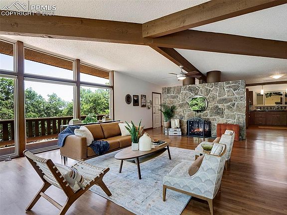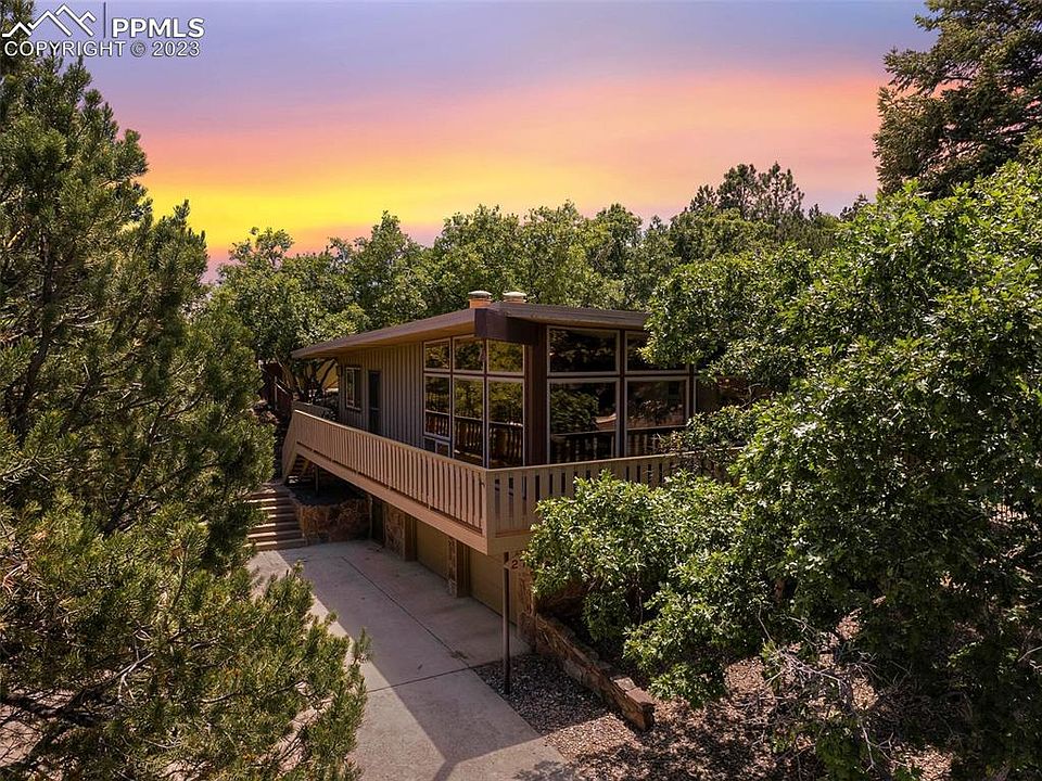This gem of a mid-century modern home, tucked into the canopy of Gambel oaks in Skyway Estates is such a find! Pull into the gated in & out driveway to get a real sense of the lot. With a wraparound deck, stone pathways, terraced outdoor spaces and a custom-made viewing platform, this remarkably preserved home has a surprise at every turn. Built in 1964 with all the charm from the era but with modern conveniences you’ll fall in love with; step in to experience the incredible use of space & light in the living room with its wall of windows and vaulted ceiling with exposed wood beams. Enjoy the original, 2-sided, wood burning fireplace with mossy stone surround & double circular chimneys or, nestled high above the street and with twinkling city lights in the distance, step onto the deck to take in the view. The dining room, with a second main level entrance, is just steps from the kitchen; both retain much of the original teak paneling, cabinetry, and beautiful cherry wood flooring. Also on the main level, the primary suite has newer carpeting, newer windows (throughout) and a dramatic beam overhead. Rounding out the main level, another bedroom & full bath, coat closet, & pantry. Venture down the stairs into the finished basement living spaces. A rec room, 2 bedrooms, a ¾ bath & oversized mud room with w/d all contribute to the home’s functional mid-century roots and fit very nicely into the way we live today. From this level, step into the 2 car garage with built in workbench and storage or exit through the private entrance to the garden. Once in the terraced side yard, you’ll appreciate established oak trees, pocket gardens with stone walls, nooks crannies & storage shed. Follow the stone pathways leading to the terrace & covered viewing platform in the trees. This gem is ready to welcome the next stewards of its historic integrity.