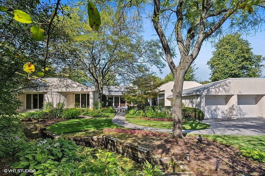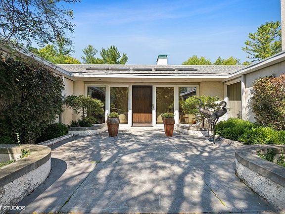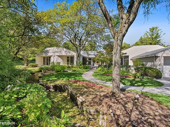 Spectacular Estate on 3 acres, some of which is prairie, so not much maintenance yet very beautiful. This lovely home is quite private. Located at the end of a private tree lined drive, this contemporary ranch was custom built and designed by the current owners and offers an amazing floor plan with a spectacular wall of windows along the back of home offering exquisite views of the large in ground pool, hot tub and grounds. Deco design through-out.....Easy access to the outside can be found throughout numerous patios. This very cool home has 4 bedroom, 4.2 baths with a finished lower level. A one of a kind library one might see in a movie with wall to wall bookshelves, dramatic ceiling & lighting which will be your favorite room no doubt. 12 foot ceilings can also be found throughout the home, a Cook's kitchen with 3 ovens and 2 side by side Subzeros, hi-end appliances with an island and counter space as well as ample space for a large table seating 6. Other features include a 3 season room, oversized and elegant master suite with steam shower, his & her baths with spacious closets and FP. 3 zoned heating and air, hardwood flooring, extensive landscaping surrounding entire home, pool & hot tub. The appointments throughout this home are very high end, although some updating is needed. Room to add pool house, Pickleball or sport court. 3 car attached garage. This home has high end finishes in which one can actually feel the quality. Private and sophisticated, you must see to truly appreciate.