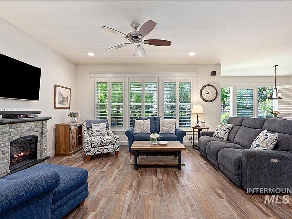 Experience the best of Idaho living in this beautiful Brighton-built home in the highly sought-after Tuscany neighborhood. Inside, this immaculate home shines with fresh paint, gorgeous 4 1/2" plantation shutters and new flooring, featuring durable LVP and plush carpet throughout. The kitchen features granite countertops and stainless steel appliances. Upstairs, you'll find 3 spacious bedrooms plus a cozy loft area, perfect for relaxing or tech space. Step outside to a covered patio and a fully fenced yard, ideal for an outdoor bbq and entertaining. Enjoy the community perks of 4 pools, a clubhouse, several playgrounds, water features, a city park just steps away, and miles of walking paths right from your backyard. Bonus! Refrigerator, Washer, Dryer Fireplace and Polk Audio Surround System included. Conveniently located near shopping, the freeway, and an elementary school within the community, this home combines comfort and convenience in one fantastic package.