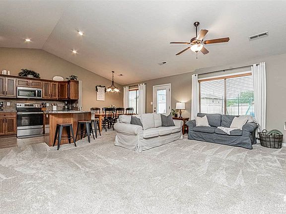 Enhanced to perfection, this stunning 4 bedroom, 2 bathroom home in Prairie Lakes offers main level living on a peaceful cul-de-sac in Northeast Manhattan. With 1500 sq ft of living space, this home boasts an open floor plan with vaulted ceilings, an inviting eat-in kitchen with updated appliances, and a spacious dining area. The primary bedroom features an attached bath with dual-vanity sinks and a walk-in closet, while the additional bedrooms are generously sized with ceiling fans. Outside, you'll find a vinyl fenced backyard with oversized patio space, two apple trees in the back yard, and a beautiful Bradford pear tree in the front yard enhancing the overall appeal of this well-maintained property. This well-maintained property boasts a hassle-free buying experience with its move-in ready condition and overall appeal.
