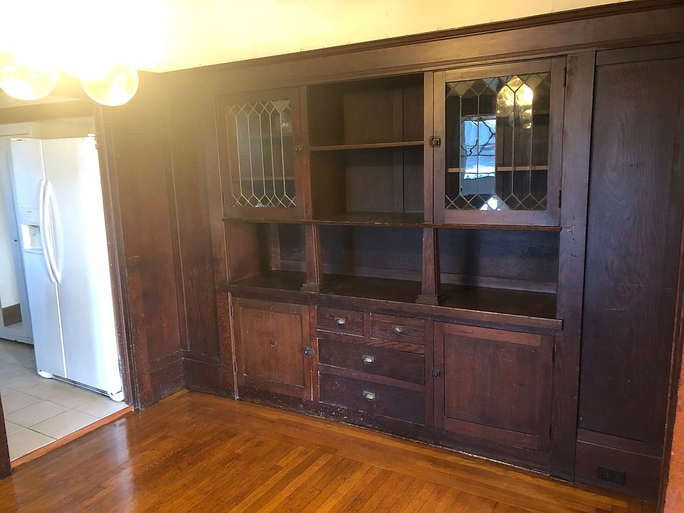 First floor. Old craftsmanship style. Feeling is not like normal apartment living. 981 square foot living space with large living room, formal dining room, newly remodeling kitchen. Good size 1 bedroom with a big study. The study can be used as another bedroom. Plus large sun room, 1 updated full bath room. Hardwood Floor, beautiful wood panel, and built-in cabinets. Laundry room in the building. (Laundry is free) Nice out door patio. Some Bay view.