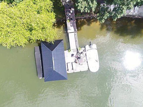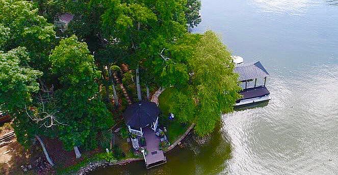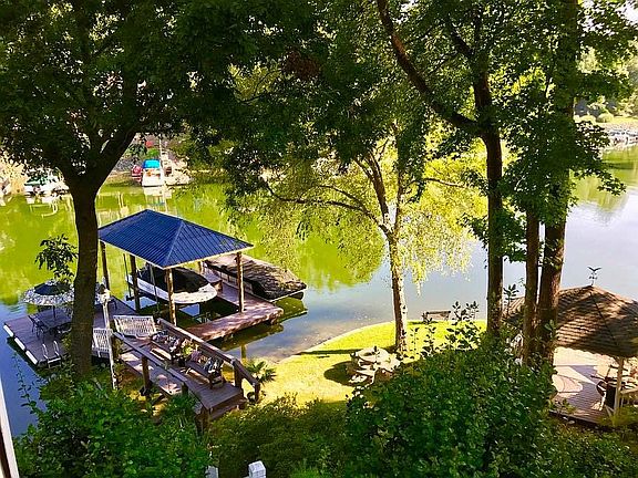 Waterfront home with boat lift, dock, gazebo,black aluminum fencing, block seawall, beach area, extensive trek decking, 2 car garage, extra parking deck, updated kitchen and baths, jet tub, fresh paint, gas logs, updated light fixtures, hardwood & tile floors, rock walls, knotty pine sunroom, stain glass, stainless steel appliances , 100+ ft.waterfront, deep water, sandy shoreline, open floor plan, energy efficient siding , shake, and rock. tranquil cove yet main channel view.