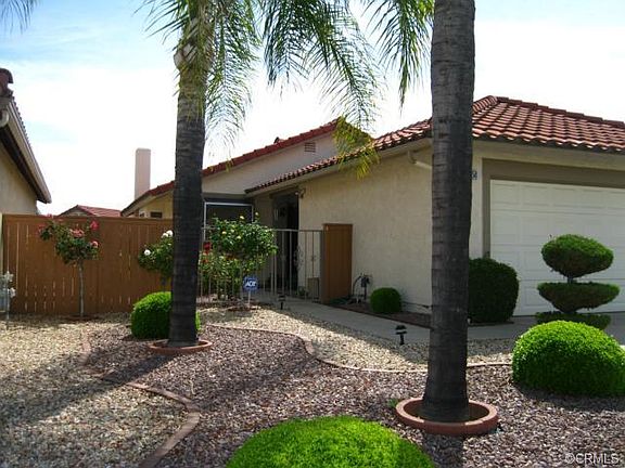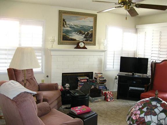 Senior living with a community club house and pool with low HOA dues. 2 large bedrooms and 2 baths, spacious 2 car garage, large family room with a fireplace, charming kitchen and nook area. The interior has been freshly painted in a neutral color, there are beautiful shutters on most windows, alarm system, walk-in closet and there is an inside laundry room. This home also has a lovely rear yard with a large patio cover and beautiful fruit trees and roses.