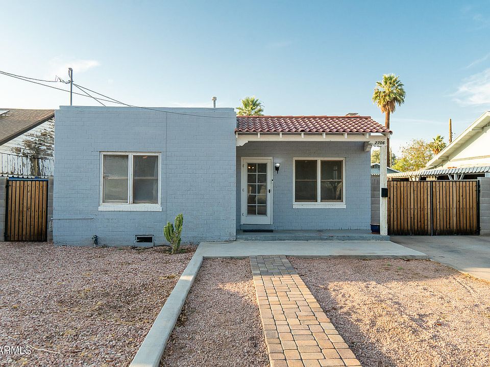 *Fresh Exterior Paint*; shown in photos 2-5. Discover 2706 E Willetta St, an 830 sq ft gem in the heart of Phoenix. This 2-bedroom, 1-bathroom home, built in 1936, exudes character with its original features, hardwood floors, and cozy fireplace. The kitchen retains its original cabinets with updated counters, awaiting your personal touch. While structurally sound, this home invites your creative vision to enhance its beauty. The spacious yard with a covered patio offers great landscaping potential. The 4-car garage is perfect for a workshop or potential ADU conversion. Located near downtown, ASU campuses, and major routes, it's ideal for students, professionals, or investors. Seize this opportunity to restore and personalize this charming home, enhancing its value and making it yours.